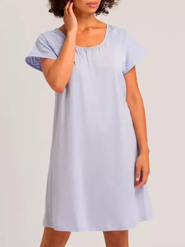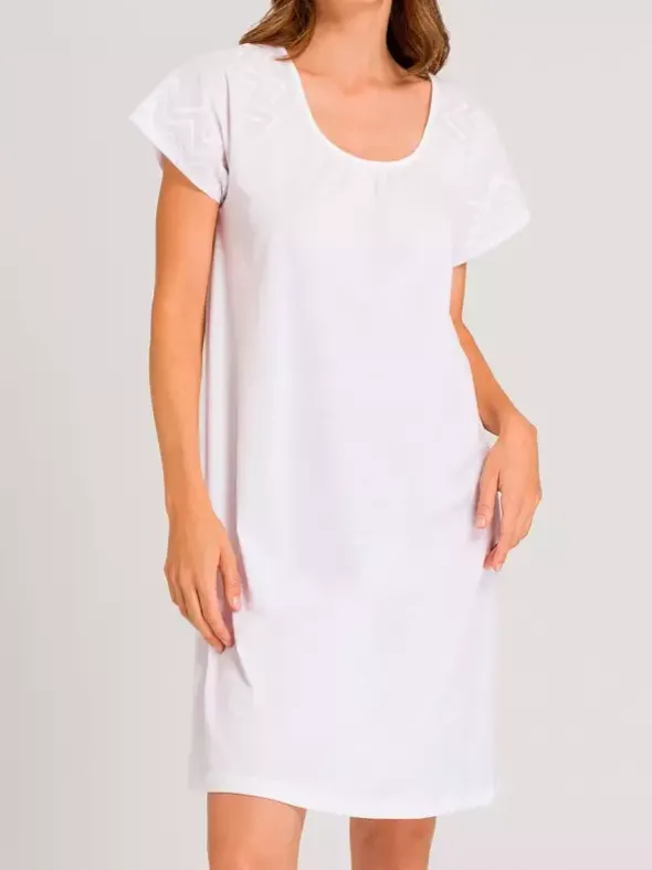 Das sommerlich leichte, 100cm lange Nachthemd aus der Serie Vivia verspricht einen luftig lockeren Tragekomfort. Der besonders fein gewebte Batist liegt dank der verwendeten, merzerisierten Baumwolle absolut angenehm auf der Haut. Durch die gezackten Stickerei-Streifen entsteht ein charmanter Retro-Apperal. Ein perfekter Look für warme Sommernächte oder auch zum Loungen.