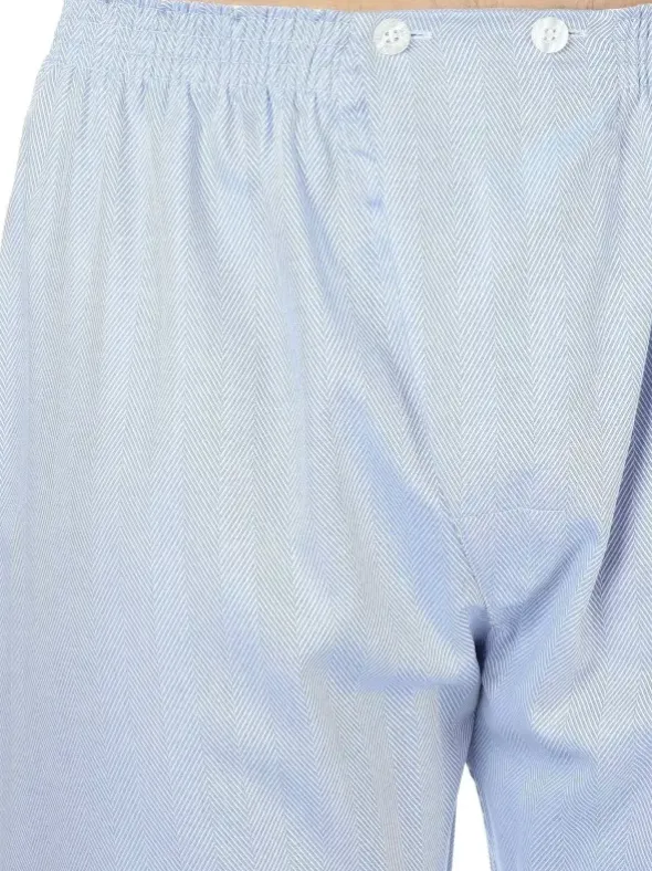 Der klassische NOVILA Pyjama in der beliebten Schnittform Marco – hier vorgestellt mit aufwendig gewebtem Fischgratmuster. Das fein strukturierte Baumwollgewebe begeistert durch einen dezenten Glanz und einen festen Griff. Neben dem typischem Reverskragen ist das durchgeknöpfte Oberteil mit zwei aufgesetzten Taschen versehen. Die gerade geschnittene Hose sitzt dank des patentierten NOVILA Softbundes bequem und druckfrei. Der geknöpfte Eingriff erlaubt das Öffnen der Hose am Bund. Ein legerer und stilsicherer Nachtwäschelook, welcher keine Wünsche offen lässt.