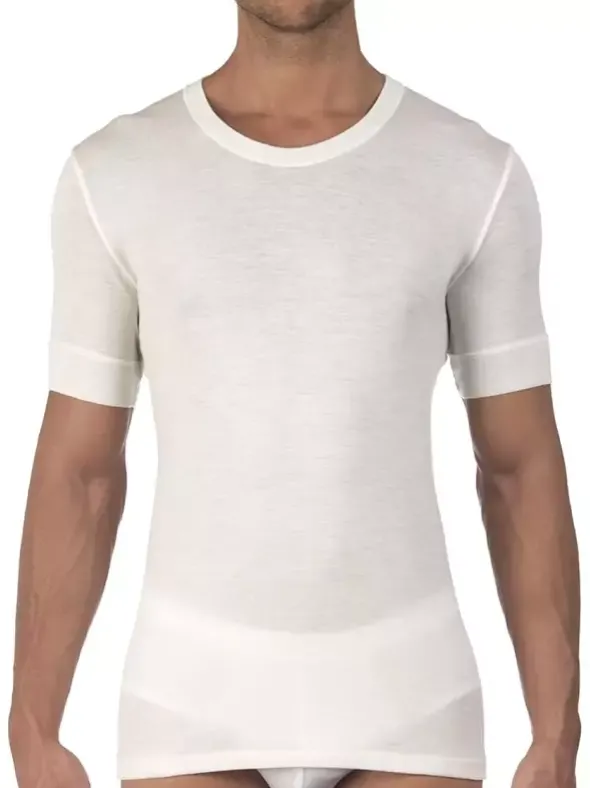 Aus der Serie Merino Wool der Luxus Marke Oscalito Unterwäsche für den Mann – klassisches Rundhals-Shirt mit kurzem Arm in creme, aus feinstem Merinowolle Gewebe und in perfekter Passform gefertigt. Das Unterhemd ist in hoher Verarbeitungsqualität und in sportlicher Schnittführung gefertigt. Tolles Tragegefühl durch fließendes Material.