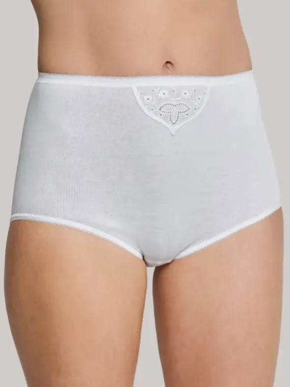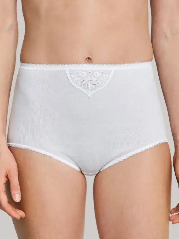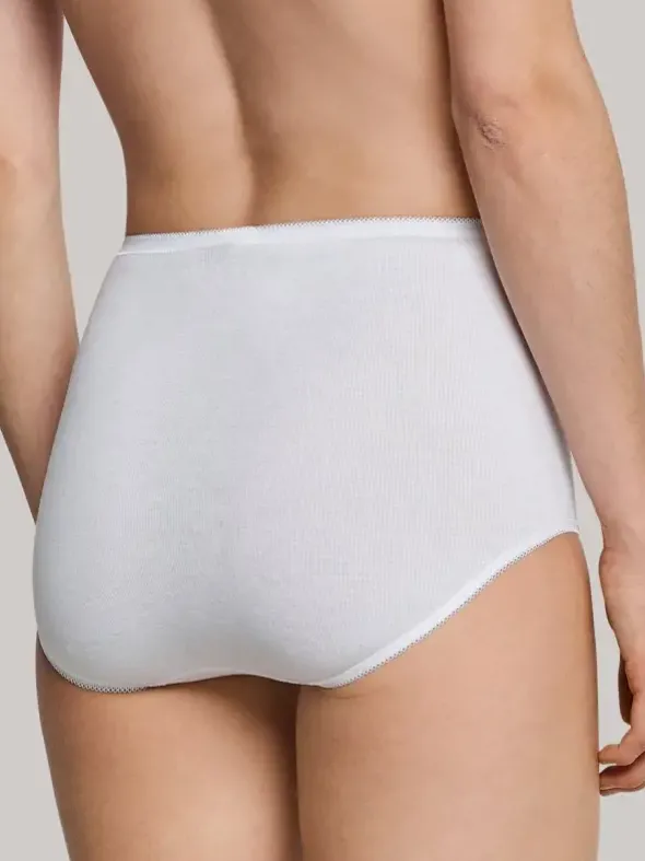 Schiesser Damenunterwäsche Serie Cotton Essentials. Hier ein klassisch geschnittener Maxi Slip mit Stickereiapplikation sowie aus einer feinen Baumwolle in Feinripp Gewebe in akkurater Verarbeitung für angenehmen Tragekomfort. Das ideale Wäsche Basic für alle Tage.