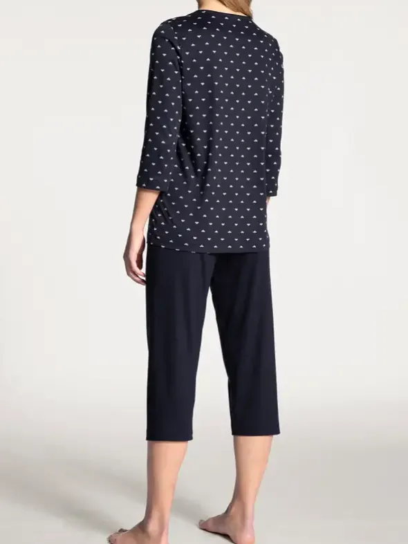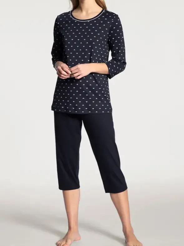 Durch hochwertige Supima®-Baumwolle in wärmender Interlock-Bindung wird Ihre Haut sanft umhüllt und verwöhnt Sie so mit erholsamem Schlaf. Die klassische Farbgebung des Capri-Pyjamas aus der Serie NIGHT LOVERS von CALIDA rundet den Look ab.