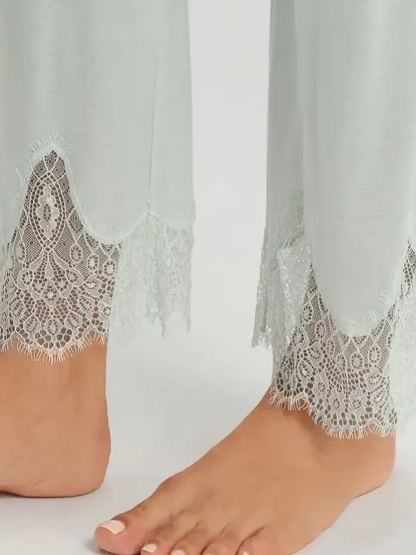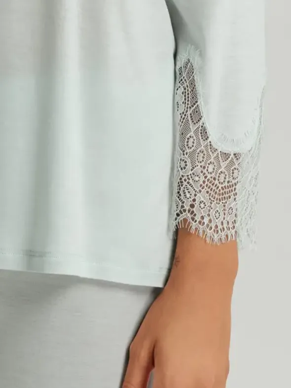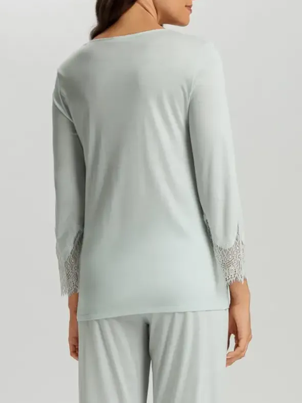 Der 7/8 Pyjama Melia von HANRO ist eine Symphonie aus Nachhaltigkeit und Stil. Dieser luxuriöse Schlafanzug, gefertigt aus 100% TENCEL™ Modal und hergestellt in der Schweiz, bietet ein unvergleichliches Tragegefühl und schont zugleich die Umwelt. Die leicht transparente Bogenspitze an Ärmeln und Hosenbeinen verleiht diesem Set eine verführerische Note, während der schimmernde Stoff die Silhouette elegant umspielt. Perfekt für Frauen, die auch bei ihrer Nachtgarderobe Wert auf Umweltfreundlichkeit und Eleganz legen, garantiert dieser Pyjama ruhige Nächte in einem Outfit, das so gut aussieht, wie es sich anfühlt.