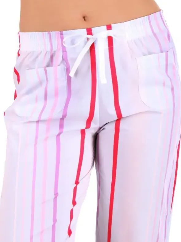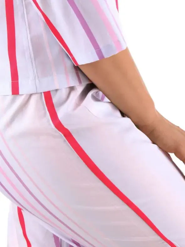 Der NOVILA Damen 7/8 Pyjama Nora vereint feminine Farbtöne und erstklassige Qualität in einem leichten Popeline-Gewebe. Dank 100% Baumwolle mit Vollzwirn-Verarbeitung kommt die zarte Streifenoptik besonders schön zur Geltung. Das Oberteil mit eckigem Reverskragen und 7/8-Ärmeln betont die moderne Silhouette. Die 7/8-Hose mit aufgesetzten Taschen und Novila-Bund bietet dir einen bequemen Sitz. Diese Kombination ist perfekt für alle, die Komfort und Stil auf hohem Niveau genießen möchten.