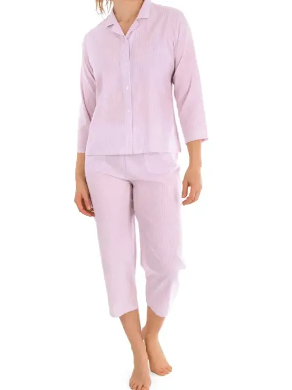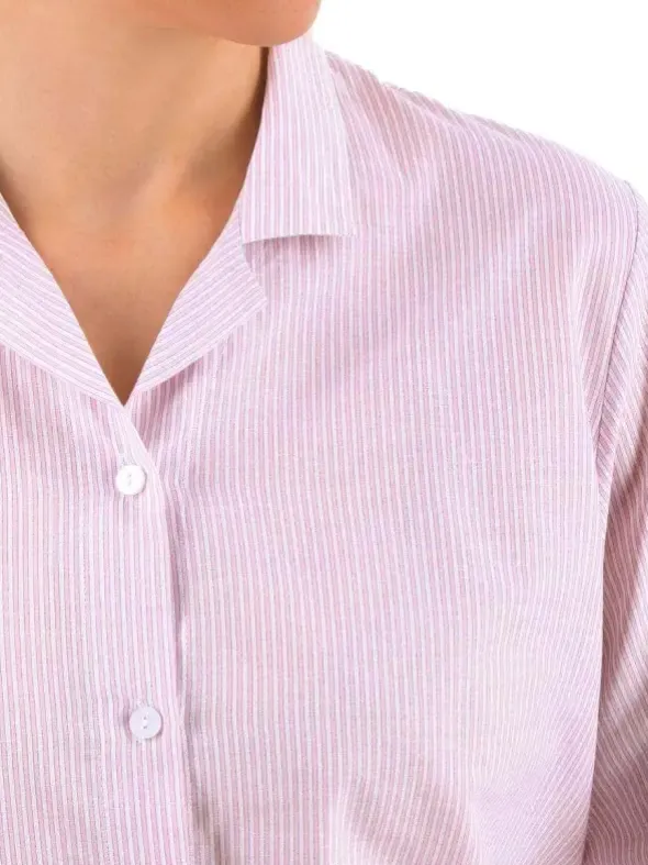 Der NOVILA Damen 7/8 Pyjama Nora vereint sommerliche Leichtigkeit mit hochwertigem Streifendesign. Gefertigt aus 100% Baumwolle in zartem Voile, fühlt sich das Material angenehm luftig an. Eine 7/8-Jacke mit eckigem Reverskragen und 7/8-Ärmeln sorgt für eine moderne Silhouette. Dazu passt die 7/8-Hose mit zwei aufgesetzten Taschen und Novila-Bund perfekt. Das Ergebnis ist ein stilvolles Ensemble, das sich besonders für warme Monate eignet.