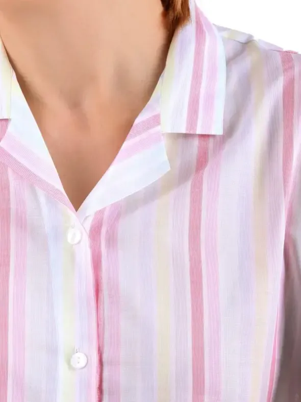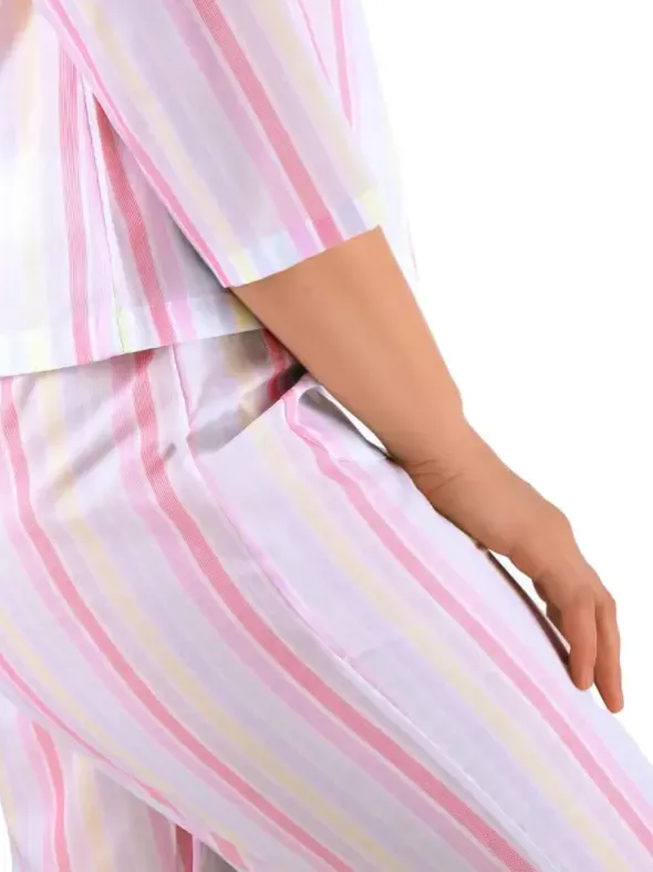 Der NOVILA Damen 7/8 Pyjama Nora präsentiert sich in einem fröhlichen Streifendesign aus Popeline-Voile. Das hochwertige Baumwollgewebe ist kaum spürbar auf der Haut und schenkt dir ein traumhaft leichtes Tragegefühl. Eine 7/8-Jacke mit eckigem Reverskragen und Ärmeln in 7/8-Länge unterstreicht die moderne Note dieses Modells. Die passende Hose mit 7/8-Länge, aufgesetzten Taschen und komfortablem Novila-Bund vervollständigt das Set. Dank der edlen Verarbeitung ist dieser Pyjama wie geschaffen für einen erholsamen Schlaf.