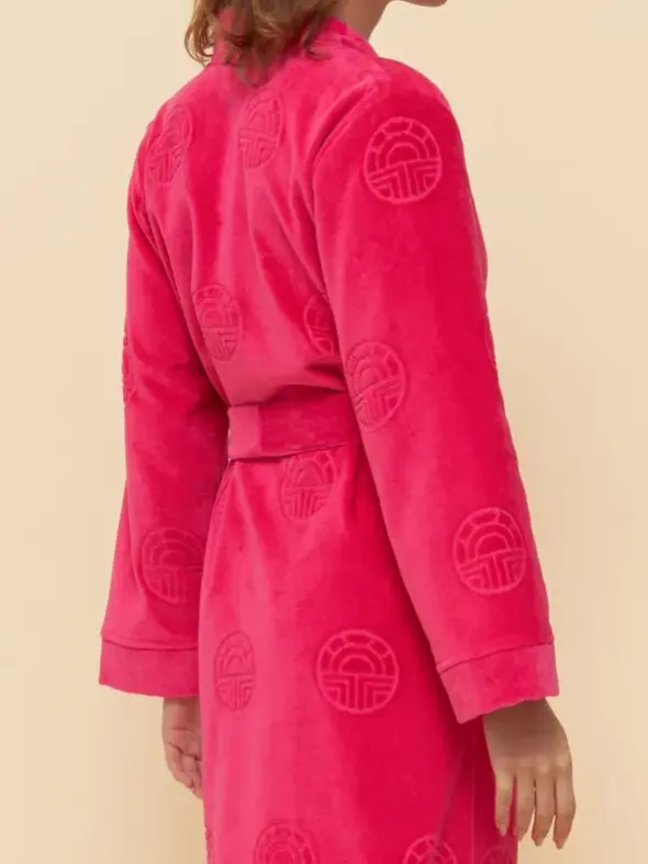 Kurzer Bademantel von Féraud im besonderen Design. Der 95cm lange Mantel aus fein geschorenem, samtig glänzendem Baumwoll-Jaquard ist mit modernen Logomotiven versehen. Für ein flauschiges Tragegefühl ist die Innenseite mit voluminösen Frotteeschlingen versehen, welche zudem Feuchtigkeit schnell aufsaugen. Gönnen sie sich dieses edle Modell für Ihren nächsten Wellness-Ausflug und seien Sie sich einem stilvollen Auftritts gewiss.