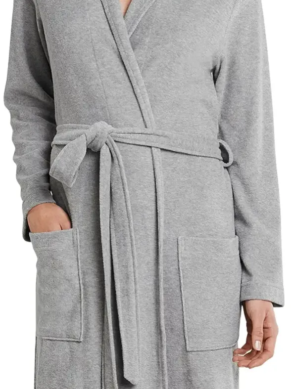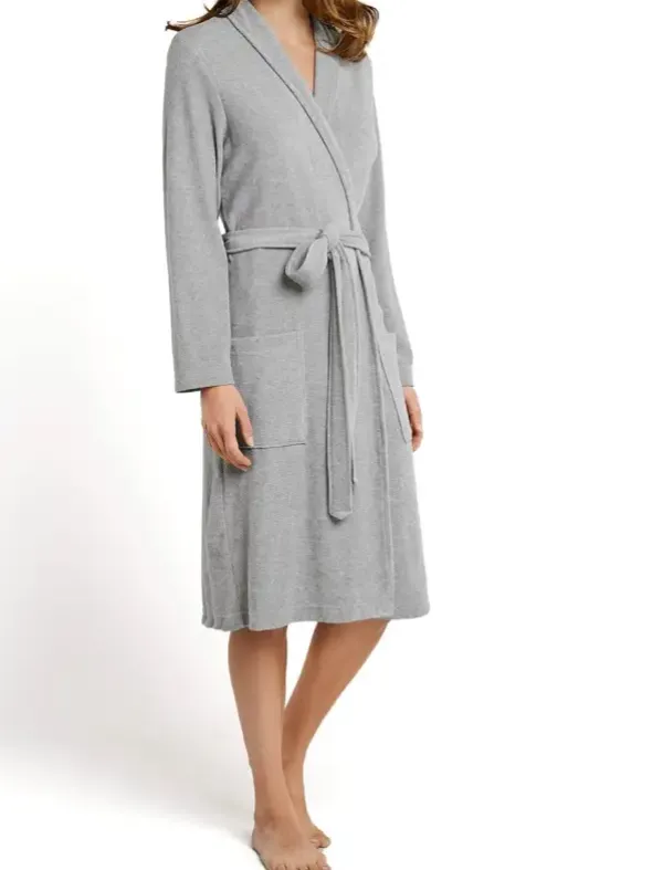 Lockerleicht Wohlfühlen: Dieser grau melierte Damenbademantel ist die perfekte Kombination aus feinem Design und gemütlichem Material. Ein dezenter Kragen, Taschen und das innere Bindeband schenken dem Bademantel dabei einen behaglichen Charakter, der sich im leichten Frottee Außen und mit glattem Material im Innenteil herrlich sanft und leicht auf der Haut anfühlt. Genau das Richtige für Damen, die es sich nach einem schönen Bad am liebsten in bester SCHIESSER-Qualität gemütlich machen.
