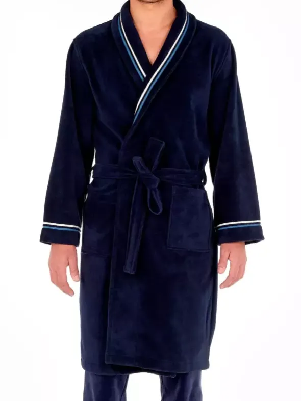 Der klassische Bademantel Transat von HOM ist ein komfortabler Begleiter für entspannte Stunden. Besonders weich und bequem umschmeichelt der Baumwollsamt Ihre Haut und bietet gleichzeitig eine gute Feuchtigkeitsaufnahme. Der gerade Schnitt mit Bindegürtel und großen Eingrifftaschen schafft eine ideale Passform. Die modernen Paspelierungen runden den OEKO-TEX® zertifizierten Look ab.