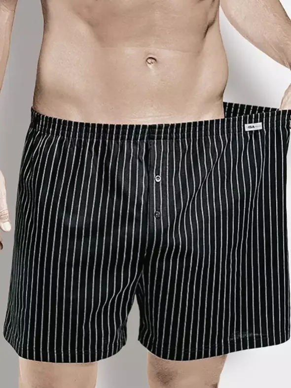 Diese Boxershorts mit geknöpfter Öffnung von ISA Bodywear aus der Serie Big Size Line wird aus 100% Baumwolle – Fairtrade Max Havelaar – in erstklassiger Qualität und Verarbeitung produziert. Diese erlesene Stoffauswahl garantiert hohen Tragekomfort und bestes Hautgefühl. Ein bequemer Bund und flache Abschlüsse, sowie die modische Gestaltung in lässiger Streifen Optik, machen dieses Unterwäschestück perfekt.