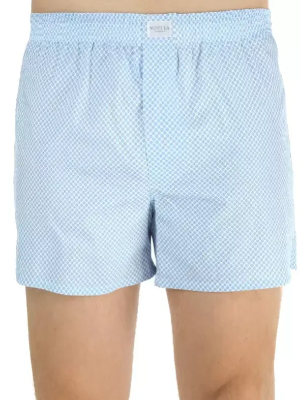 Klassische Webshorts aus dem Hause NOVILA. Hier in hellblau gemustertem Baumwollpopeline. Das glatte, luftige und gleichzeitig griffige Gewebe sorgt für ein angenehmes Hautklima. Für besten Tragekomfort wurde die Boxershorts hochwertig mit einer zusätzlichen Gesäßnaht und Seitenschlitzen versehen. Ein verdeckt gefertigter, mit einem Knopf verschließbarer Eingriff und der patentierte NOVILA Softbund machen machen die Shorts schnell zum Lieblingsbegleiter im Alltag.