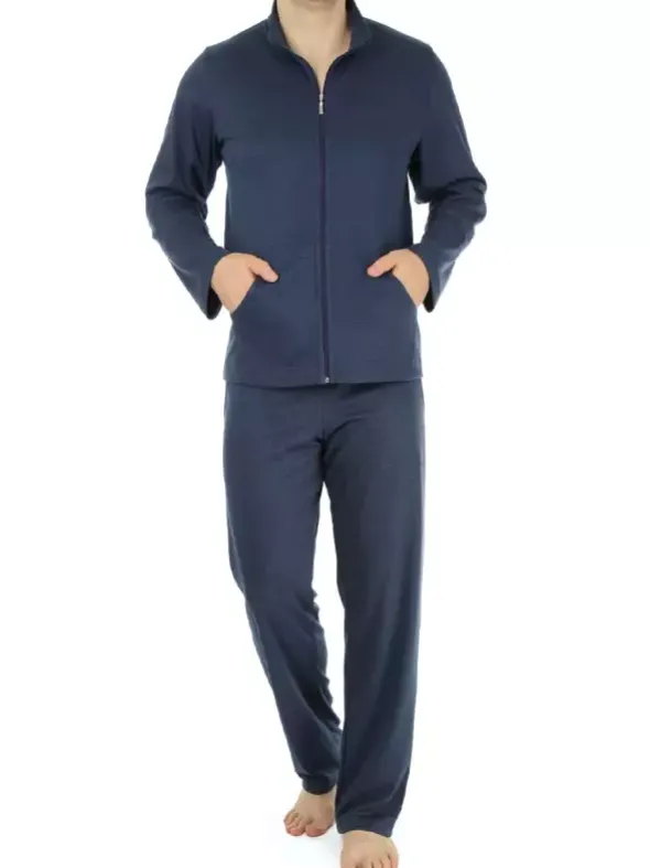 Der legere Hausanzug Micha – hier in einer Ausführung aus weichem Interlock aus 100% Baumwolle. Der komfortable Zweiteiler in edlem Marineblau überzeugt mit Liebe zum Detail. Ob die hochwertig verarbeiteten Zipper, die runden Eingrifftaschen oder der passend abgesetzte Webstoff an den Tascheninnenseiten – hier spricht jede Naht für eine exquisite Verarbeitung. Die gerade geschnittene Hose wartet mit einem elastischen Gummibund mit Bindeband zur Weitenregulierung auf. Die Hosentaschen bilden ein praktisches Extra. Machen Sie keine Abstriche bei Ihrem Wohlbefinden und überzeugen Sie sich selbst von diesem NOVILA Klassiker.