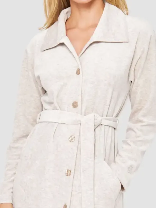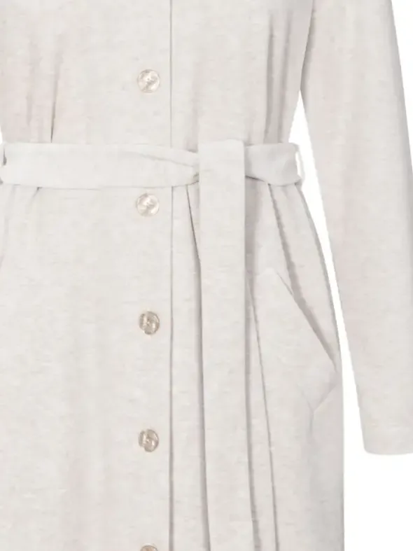 Dieser komfortable Hausmantel vereint einen hohen Tragekomfort mit eleganter Optik. Der weiche Nicki-Stoff liegt angenehm soft auf der Haut und sorgt für wohlige Geborgenheit. Ein stilvoller Look entsteht zudem durch die elegante Knopfleiste und den zusätzlichen schmalen Bindegürtel. Ein spitzer Kragen und schräge Eingrifftaschen runden das Outfit wunderbar ab. Die Robe ist 120cm lang.