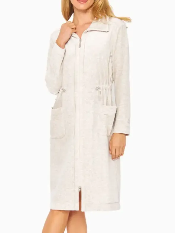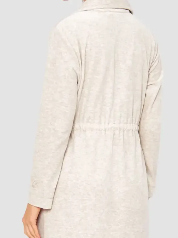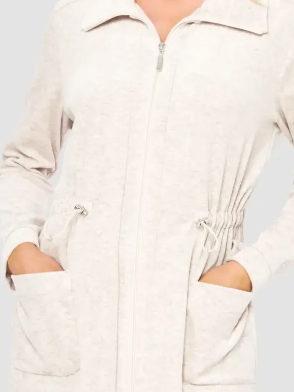 Gönnen Sie sich diesen gemütlichen Hausmantel aus wunderbar weichem Nicki-Stoff für pure Gemütlichkeit. Die Robe besticht mit einem edlen Metallzipper, der kurze Stehkragen ist ebenso auch in Reversform tragbar. Zwei Eingrifftaschen und ein modisches Zugband in der Taille sorgen für praktischen Tragekomfort.