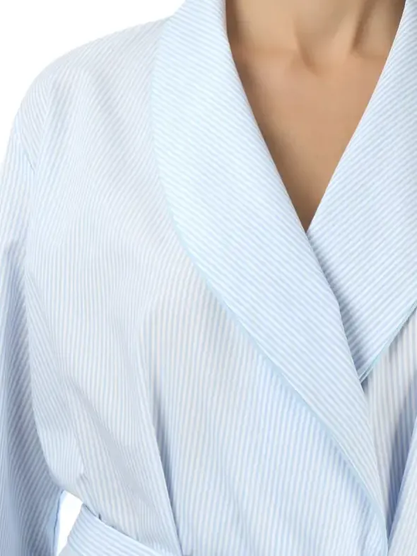 Dieser leichte Morgenmantel der Bonsoir of London Kollektion macht Sie im Nu bereit für einen gemütlichen Start in den Tag. Der Morgenmantel ist ungefüttert und wurde mit viel Sorgfalt aus einer hochwertigen Baumwoll-Popeline gefertigt. Das feine Streifendesign unterstreicht perfekt die klassische Schnittführung mit elegantem Schalkragen. Zwei unsichtbar eingesetzte Eingrifftaschen runden den Morgenmantel praktisch ab. Mithilfe eines Gürtels und zweier innenliegender Fixierbänder läßt sich der Mantel bequem schließen.
