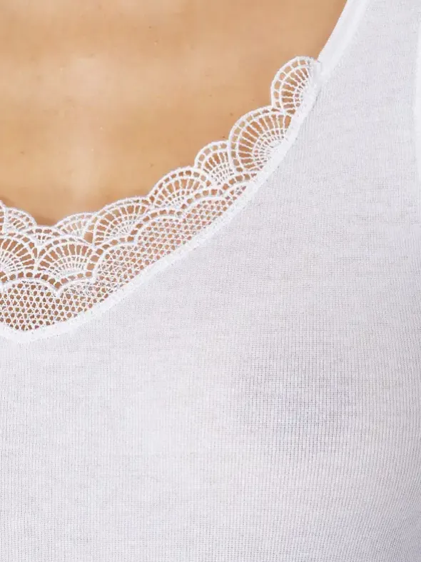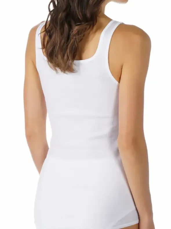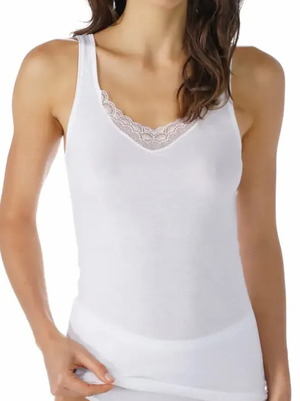 Mey 2000 – die feminine Lingerie Serie – hier ein bequemes und hochwertiges Tank Top in perfekter Passform, in der Farbe weiß erhältlich. Das Top ist mit breiten Trägern und flachen Abschlüssen und funktionsgerechtem Rundschnitt gearbeitet sowie aus sehr leichtem Material und dezenter Guipure Motiv Stickerei. Das weiche Gewebe aus reiner, supergekämmter Baumwolle sorgt für Formstabilität und behaglichen Tragekomfort.