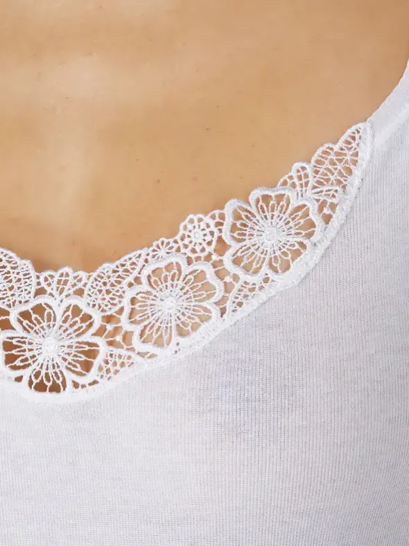Klassisches Damen Spaghetti Top aus 100% supergekämmter Baumwolle aus der mey Serie 2000. Flache Abschlüsse und die seitennahtfreie Verarbeitung sorgen für ein perfektes Tragegefühl für jeden Tag, während der V-Ausschnitt von einer edlen Stickerei gesäumt wird.