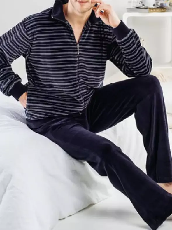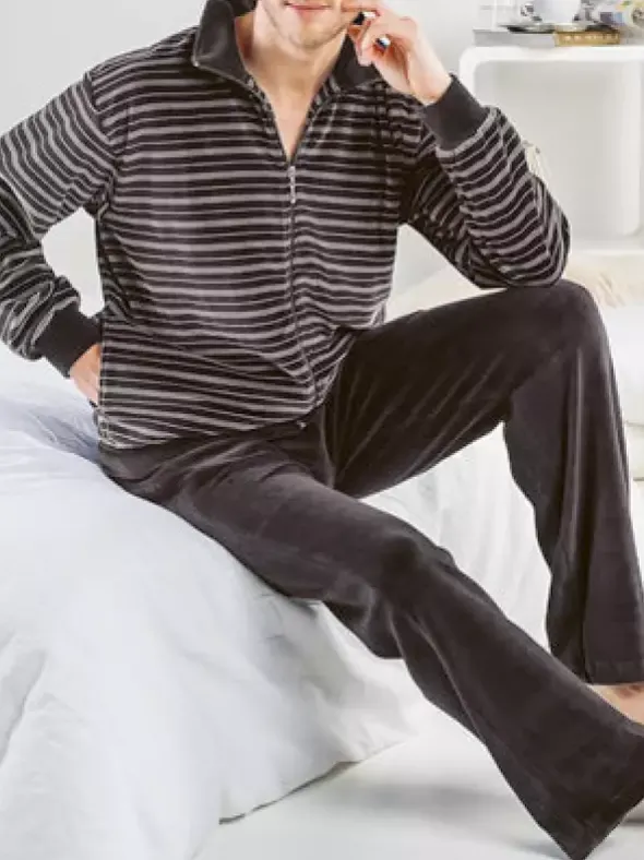 Dieser modische Zweiteiler in kuschliger Materialkombination mit hohem Baumwollanteil der Marke ISA Bodywear gehört einfach in jeder Homewear – Garderobe. Die Jacke mit durchgehendem Zipper, leichtem Stehkragen und anliegenden Armabschlüssen und Saum in modischem Streifenmuster aus grau Tönen gestaltet. Dazu passend wird eine lange Hose in geradem Schnitt mit Kordelzug in uni Farbe kombiniert. Einfach ein Homedress zum wohlfühlen.