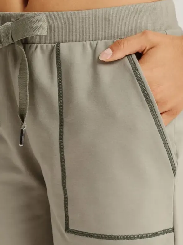 Die kurze Hose – Natural Living aus der HANRO Kollektion vereint Nachhaltigkeit und Komfort in einem modernen Design. Diese Hose besteht aus hochwertigem Sommersweat, der mit 5 % Elasthan versetzt ist, für eine besonders bequeme Passform. Der komfortable Bund mit Kordel und die zwei großen Taschen sorgen für zusätzlichen Tragekomfort. Ziernähte in Kontrastfarbe setzen auffällige Akzente und machen diese Hose zu einem Blickfang. Ob im Home-Office oder unterwegs – diese Hose sorgt für ein stilvolles und entspanntes Tragegefühl. Kombinieren Sie sie mit dem passenden Oberteil für ein trendiges Set, das perfekt für Reisen oder entspannte Stunden zu Hause geeignet ist.