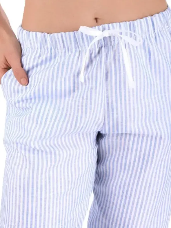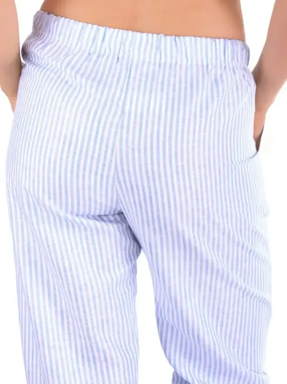 Die lange Damen Hose Leyla von NOVILA besticht durch ihre frische Streifenoptik und das leichte Leinen-Baumwoll-Gemisch. Sie liegt angenehm auf der Haut, wirkt kühlend und ist zugleich weniger knitteranfällig. Der elastische Gummibund und das Bindeband ermöglichen eine individuelle Weitenregulierung. Zusätzlich sorgen Seitennahttaschen und ein praktischer Aufhänger für durchdachten Komfort. Ob als Nachtwäsche oder entspannte Freizeitbekleidung – mit dieser Hose beweist NOVILA erneut seinen hohen Qualitätsanspruch.