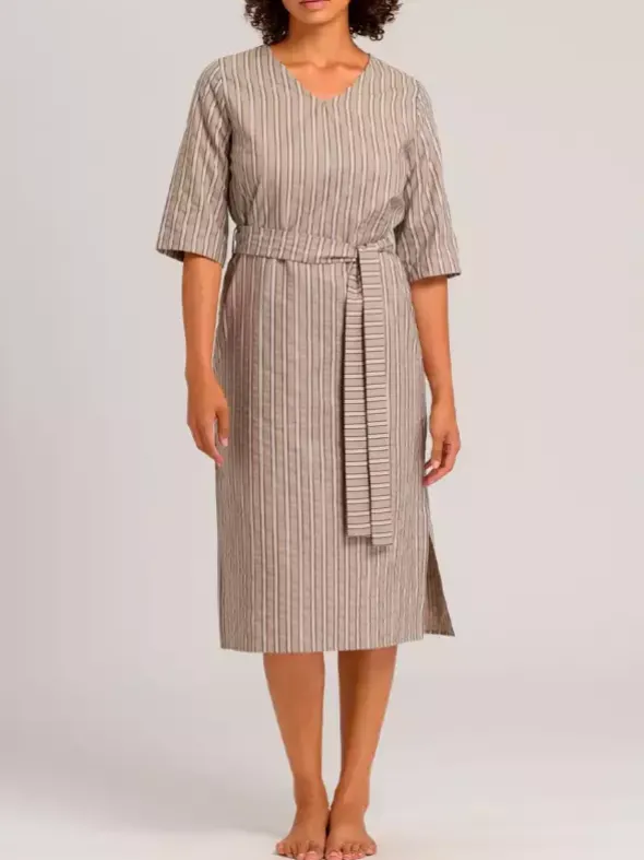 Angesagter Sommerlook aus der HANRO Serie Urban Casuals. Das modische Kleid mit Bindegürtel ist aus einem leichten Baumwollgewebe gefertigt und bietet Ihnen ein angenehm luftiges Tragegefühl. Der Schnitt mit 3/4-Arm und 120cm Länge kann sowohl schick als auch lässig gestylt werden. Der klassische V-Ausschnitt und der geschlitzte Saum runden den Look perfekt ab.