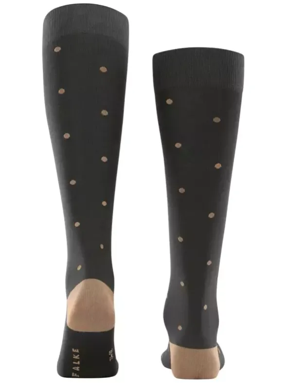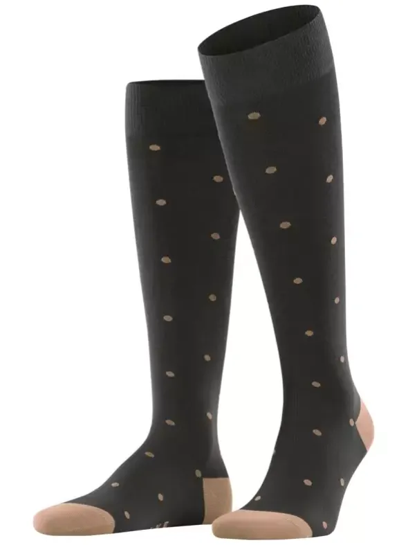 Business-Kniestrumpf aus feiner, merzerisierter Baumwolle auf der Außenseite und weicher gekämmter Baumwolle auf der Innenseite mit einer zeitlosen Punkte-Musterung. Optimale Haltbarkeit durch verstärkte Belastungszonen.
