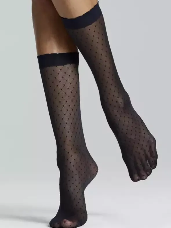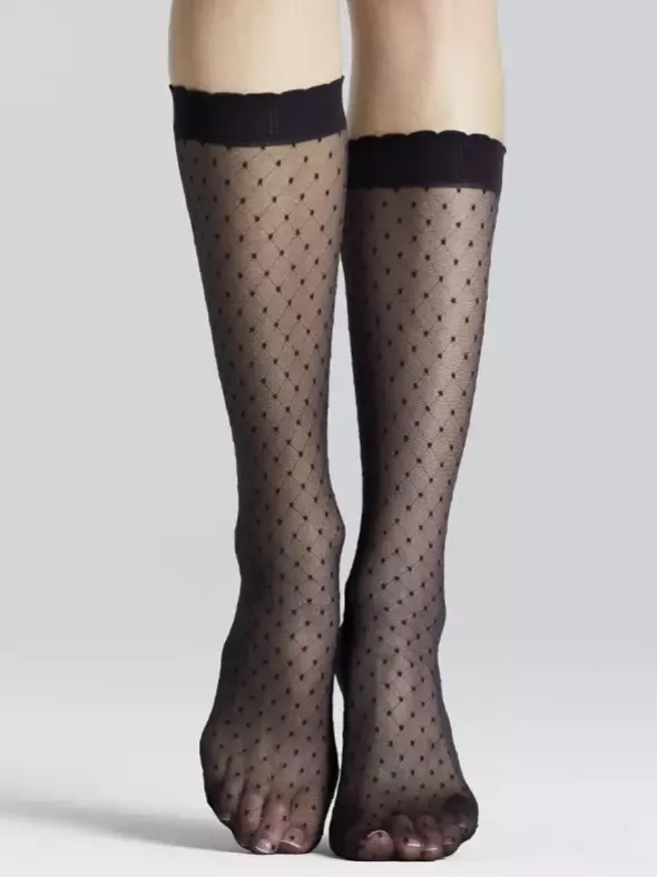 Fogal Damen Kniestrumpf mit Pünktchenmuster. Der Knee-High besticht mit leichtem Glanz und hoher Elastizität. Das klassische Pünktchen-Allover ist unterlegt mit einem feinen Rautenmuster. Modell mit Charme: anmutig-eleganter Look für jeden Anlass.