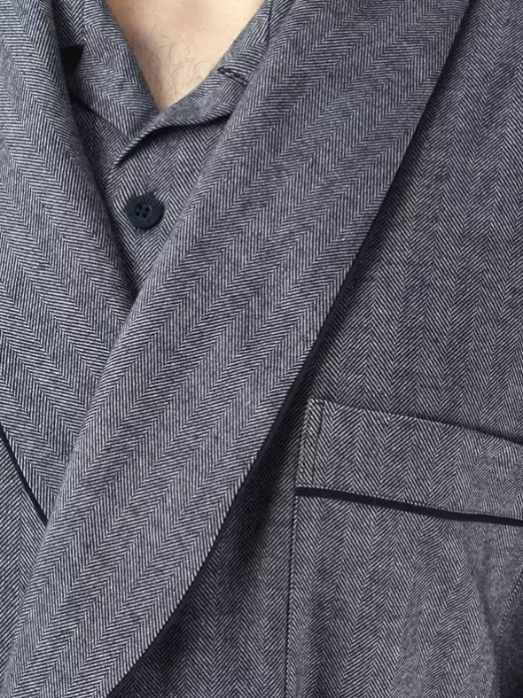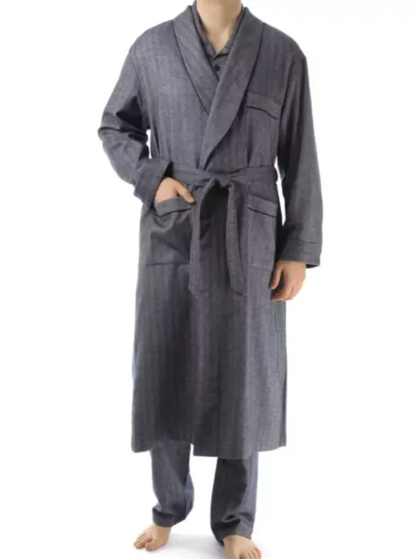 Der luxuriöse Morgenmantel Lord aus weichem und beidseitig gerauhtem Flanell ist aus 100% erlesener Baumwolle gearbeitet. Die perfekte Passform der ungefütterten und 112cm langen Robe wird durch einen praktischen Bindegürtel unterstützt. Für zusätzlichen Komfort sorgen die großen Eingrifftaschen und eine aufgesetzte Brusttasche. Das gewebte Fischgratmuster unterstützt die edle Ausführung mit den kontrastfarbenen Paspeln am Schalkragen und den Eingrifftaschen.