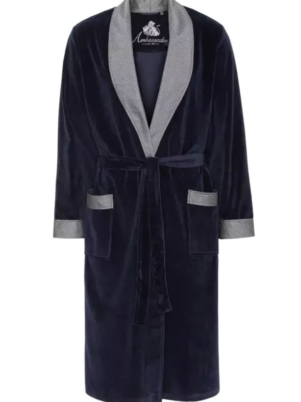 Der exquisite Morgenmantel Napoli vereint Komfort und Stil zu einem edlen Look für Männer jeden Alters. Das weiche, seidig glänzende Veloursmaterial verspricht ein geschmeidiges Tragegefühl. Der klassische Schnitt mit Schalkragen, Bindegürtel und aufgesetzten Taschen wird elegant unterstrichen durch den Besatz mit italienischem, silbergrauen Webstoff. Ein hochwertiger Look für Ihre kostbaren Momente der Entspannung.