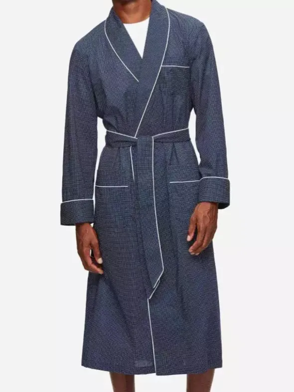 Der elegante Morgenmantel Plaza 21 ist ein stilvolles und zugleich zeitloses Wäschestück für den anspruchsvollen Herren. Gefertigt aus einem extra leichten und atmungsaktiven Batist aus reiner Baumwolle, ist dieser Mantel der ideale Begleiter für die wärmeren Monate oder über einen warmen Pyjama, wenn das Wetter kühler wird. Das klassische Schalkragendesign mit einer Brusttasche und zwei Vordertaschen ergänzt sich stilvoll zu dem minimalistischen Punktedruck. Luxuriöse Paspelierungen runden den Look ab.