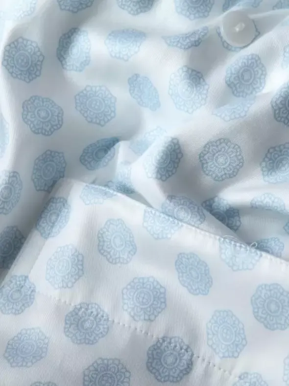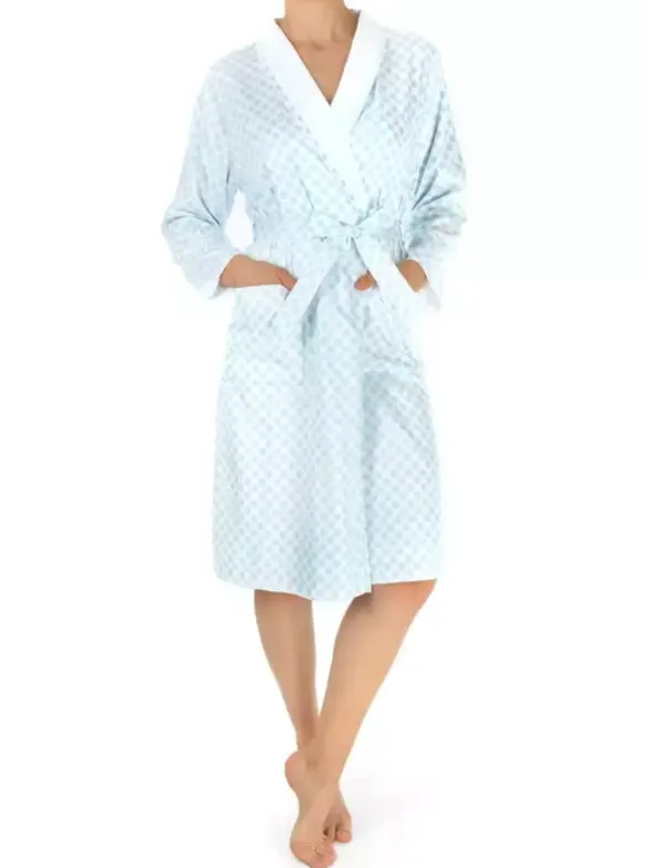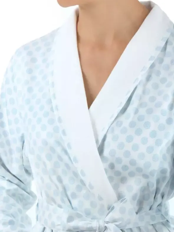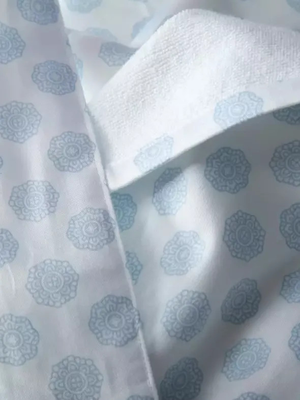 Dieser elegante NOVILA Mantel Sonja lässt keine Wünsche offen. Außen aus fein glänzendem und soften Satin und innen mit weichem Frottee gefüttert – erleben Sie mit dieser Robe höchsten Tragekomfort. Der praktische Bindegürtel und die großen Eingrifftaschen ergänzen sich ideal mit dem klassischen Schalkragen, welcher sich edel in Weiß von dem hellblau gemustertem Außenstoff abhebt.