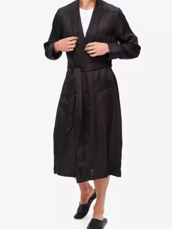 Einers der beliebtesten Wäschestücke aus dem Hause Derek Rose ist der Morgenmantel Woburn aus 100% reiner Seide. Diese wurde zu edlen Satinstreifen gewebt und ist unbestreitbar weich und leicht. Der Mantel umhüllt Sie dank seiner temperaturregulierenden Eigenschaften zu jeder Jahreszeit mit luxuriösem Komfort. Das esign ist klassisch gehalten mit Schalkragen, Brusttasche und zwei aufgesetzten Fronttaschen. Die perfekte Balance zwischen Luxus und Schlichtheit.