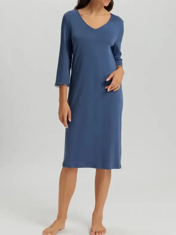 Das Nachthemd 3/4 Arm – Anouk aus 100 % merzerisierter Baumwolle verführt mit seiner unvergleichlichen Weichheit und exzellenten Hautfreundlichkeit. Der V-Ausschnitt und die eleganten, dezent dekorierten Bogenkanten an den Ärmeln, die exklusiv in Vorarlberg für HANRO kreiert wurden, verleihen diesem Nachthemd eine subtile Raffinesse. Das weiche Baumwollmaterial wirkt atmungsaktiv und pflegeleicht und sorgt gleichzeitig für eine zuverlässige Feuchtigkeitsregulation während der Nacht. Die feinen Stickereien an den Ärmeln setzen einen modernen Akzent, der das elegante Design des Nachthemds perfekt abrundet. Mit diesem hochwertigen Nachthemd genießen Sie höchsten Komfort und einen luxuriösen Schlaf.