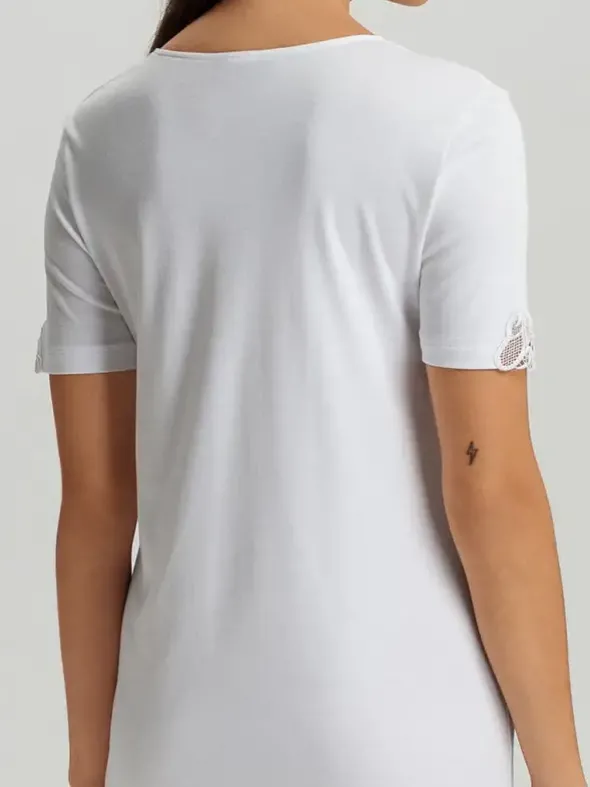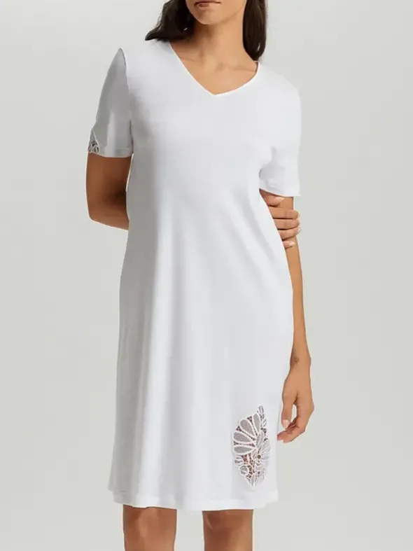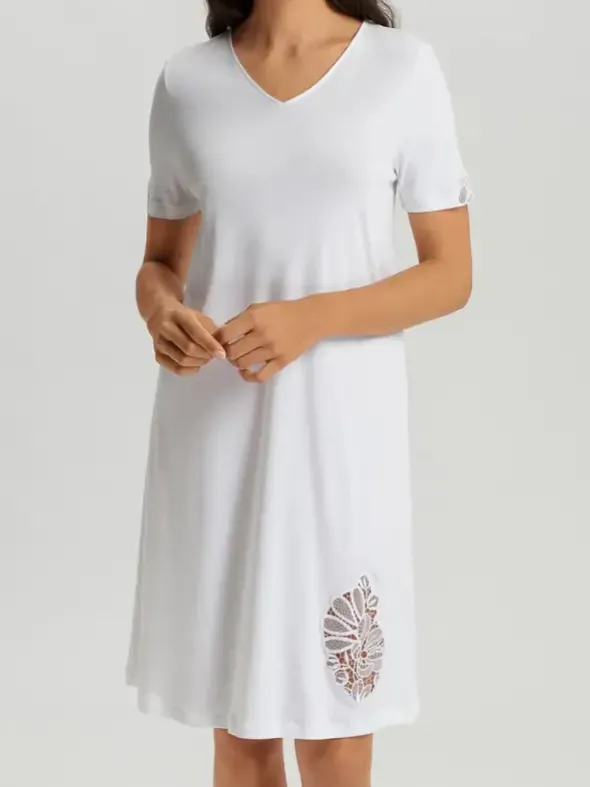 Das Kurzarm-Nachthemd Belina NW von HANRO vereint klassische Eleganz mit höchstem Tragekomfort. Gefertigt aus 100 % feinster Baumwolle und in Österreich hergestellt, bietet es ein weiches, feuchtigkeitsregulierendes Material, das sich sanft an die Haut schmiegt. Die exklusive Blütenstickerei am Saum, entworfen von HANROs Design-Team, verleiht dem Nachthemd eine edle, feminine Note. Durch das spezielle Veredelungsverfahren erhält der Baumwollstoff einen seidenähnlichen Glanz und bleibt dauerhaft schön. Ein zeitloses Nightdress für anspruchsvolle Frauen, die Wert auf Qualität, Stil und Nachhaltigkeit legen.