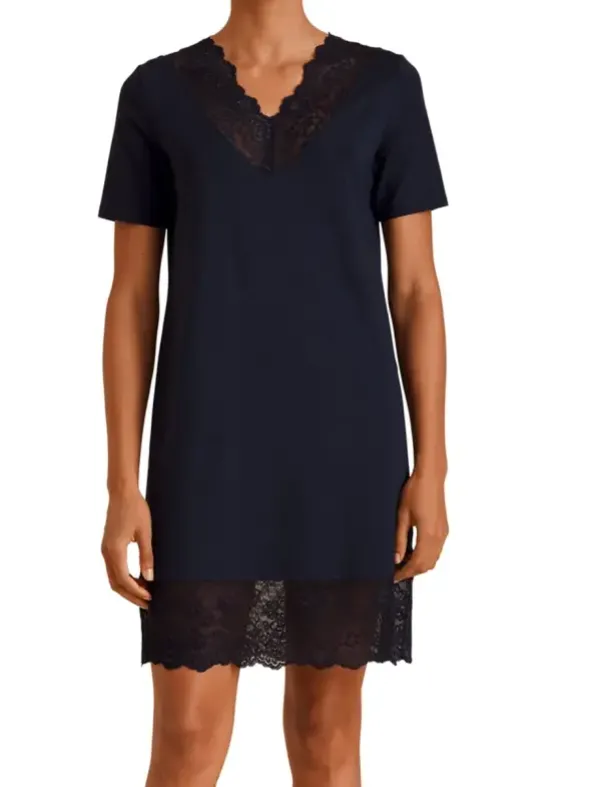Das „Elegant Dreams“ Kurzarm-Nachthemd von CALIDA bietet eine perfekte Kombination aus Eleganz und Komfort. Mit seinem geraden Schnitt, dem edlen V-Ausschnitt und dem Spitzensaum verleiht es eine feminine Note. Hergestellt aus fließendem TENCEL™-Modal, fühlt es sich angenehm weich auf der Haut an und sorgt für ein entspanntes Tragegefühl.