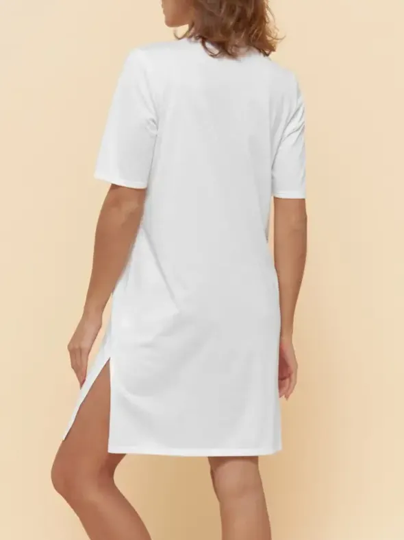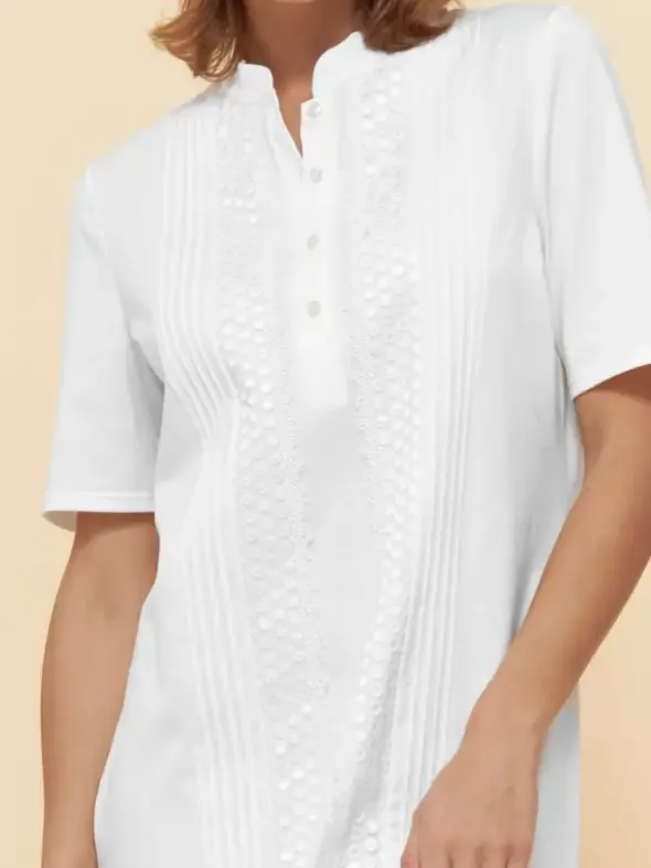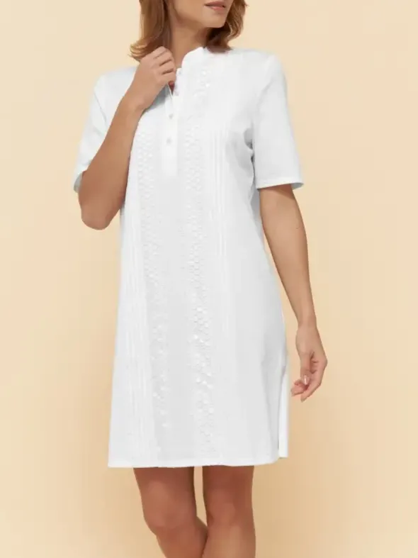 Aus dem Hause Féraud – ein klassisch feminines Damennachthemd mit kurzem Arm. Das feine Gewebe besteht aus 100% Baumwolle und ist auf der Vorderseite mit eleganten Spitzenverzierungen versehen. Der kurze Stehkragen geht in eine dekorative Knopfleiste über. Für maximale Bewegungsfreiheit ist das 95cm lange Dress mit zwei Seitenschlitzen am Saum versehen.