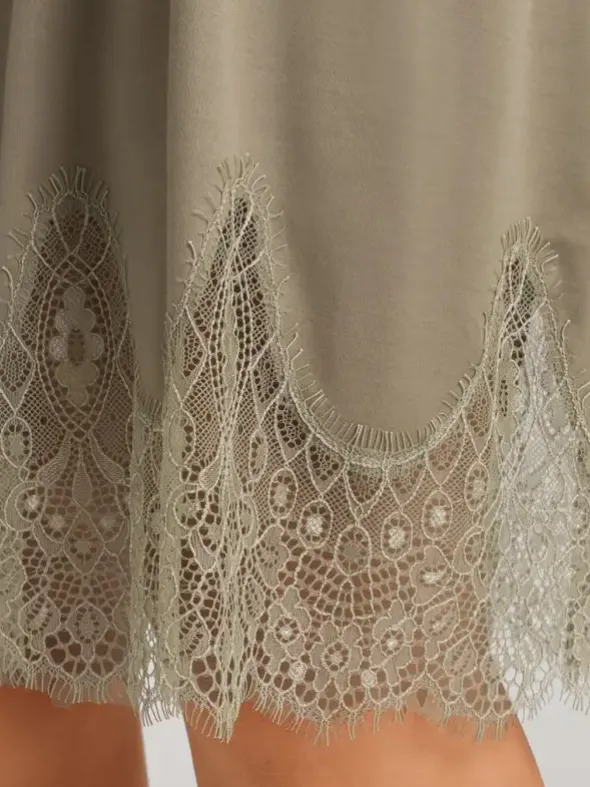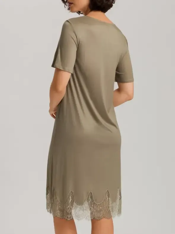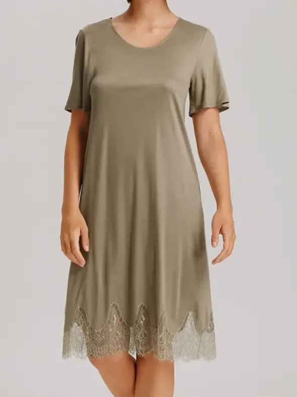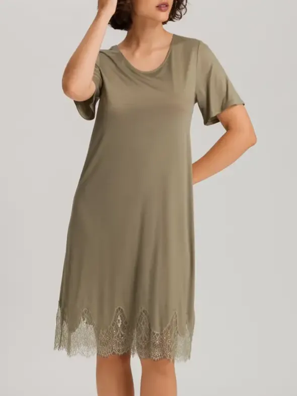 Das Melia Nachthemd Kurzarm von HANRO ist eine Hommage an klassische Eleganz und moderne Nachhaltigkeit. Aus 100 % TENCEL™ Modal gefertigt, das in der Schweiz hergestellt wird, bietet dieses Nachthemd eine außergewöhnlich weiche Textur und einen elegant schimmernden Effekt. Die großzügige Bogenspitze am Saum verleiht einen Hauch von Sinnlichkeit, indem sie diskret die Haut durchschimmern lässt. Mit seiner A-Linie, dem Halbarm und dem Rundhalsausschnitt schmeichelt dieses Kleid jeder Figur und zeichnet eine feminin zarte Silhouette. Verfügbar in Olivgrün und Hellblau, bietet es sich als perfekte Wahl für Frauen, die Wert auf Komfort, Stil und Umweltbewusstsein legen.