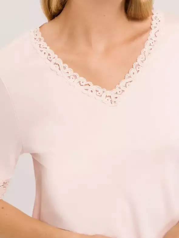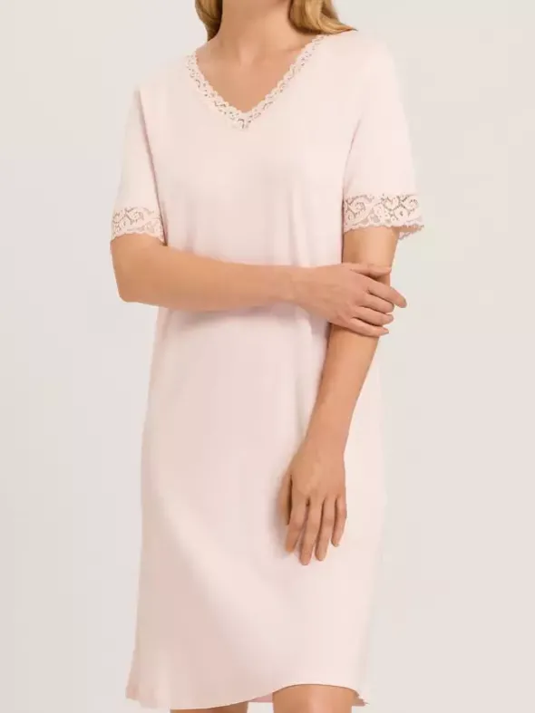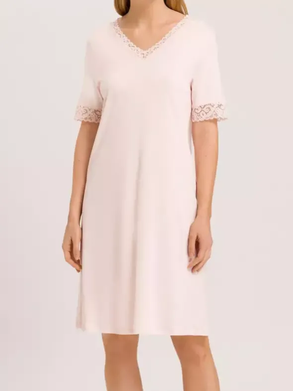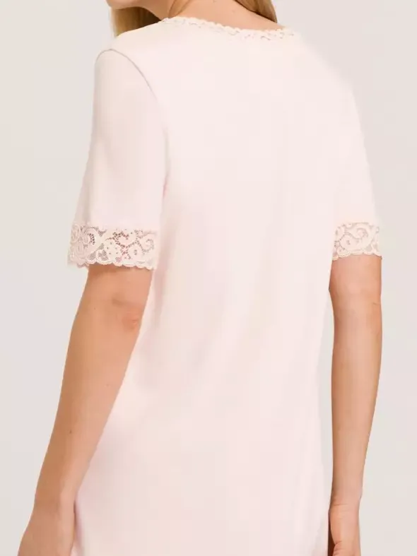 Die beliebte Nachtwäscheserie Moments von HANRO überzeugt hier im modern überarbeiteten Stil mit schmal gearbeiteter Textronicspitze und sanft fallenden Schnitt. Das hochwertige Interlockmaterial ist aus merzerisierter Baumwolle gefertigt und verspricht ein unglaublich geschmeidiges Tragegefühl. Das feminine Kurzarm Nachthemd in dezenter A-Linie ist 100cm lang und ein absolutes Must-have im Kleiderschrank.