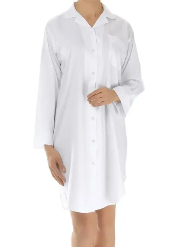 Dieses hübsche Nachthemd kann in jeglicher Hinsicht überzeugen. Die hübsche feminine Optik mit abgerundetem Reverskragen, aufgesetzter Brusttasche und zarten weißen Paspelierungen wird durch das edel glänzende Fischgratgewebe stilvoll abgerundet. Spüren Sie wie angenehm leicht das durchgeknöpfte Nachthemd aus reiner hochwertiger Baumwolle auf Ihrer Haut liegt. Die herausragende Verarbeitungsqualität und viel Liebe zum Detail und Design geben auch dieser Nachtwäsche des britischen Labels Bonsoir of London einen unverwechselbaren Look. Lassen Sie sich begeistern.
