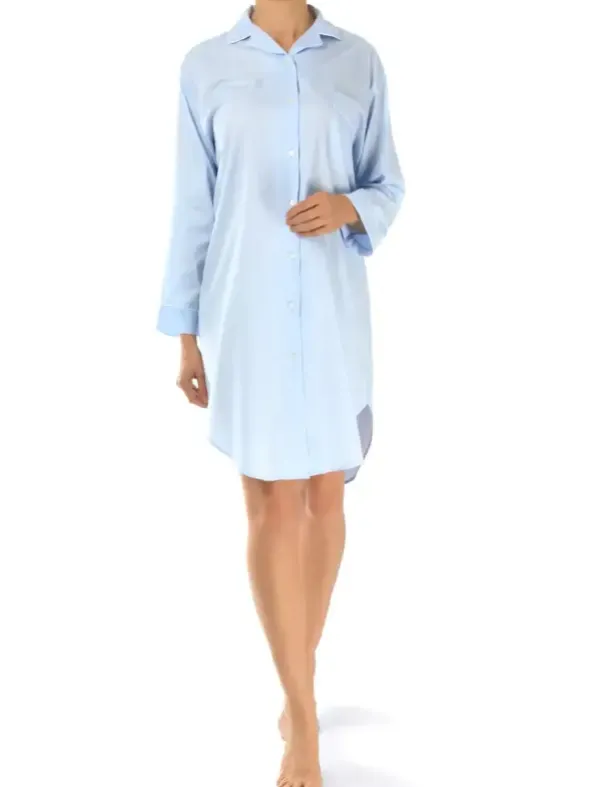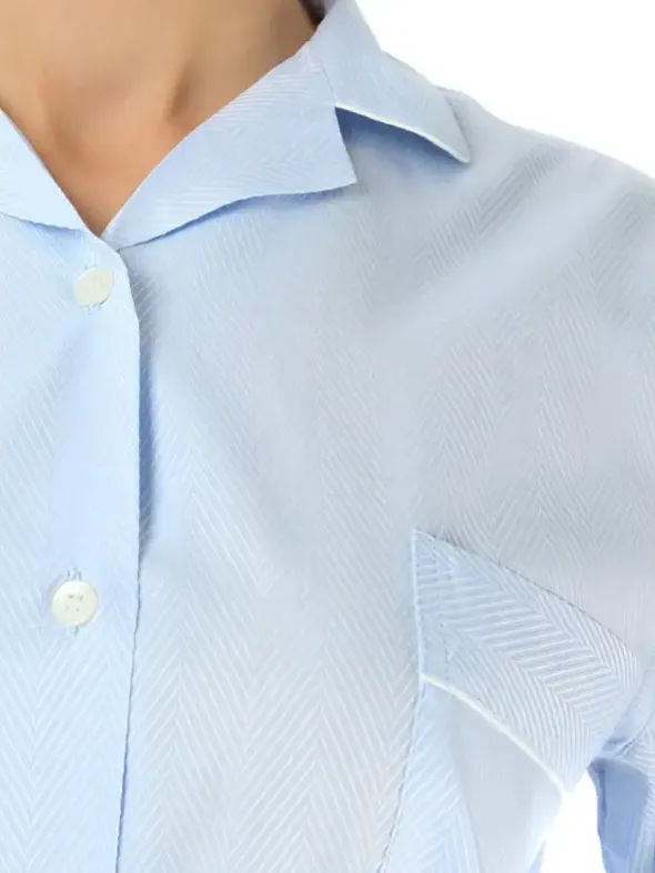 Dieses hübsche Nachthemd kann in jeglicher Hinsicht überzeugen. Die hübsche feminine Optik mit abgerundetem Reverskragen, aufgesetzter Brusttasche und zarten weißen Paspelierungen wird durch das edel glänzende Fischgratgewebe stilvoll abgerundet. Spüren Sie wie angenehm leicht das durchgeknöpfte Nachthemd aus reiner hochwertiger Baumwolle auf Ihrer Haut liegt. Die herausragende Verarbeitungsqualität und viel Liebe zum Detail und Design geben auch dieser Nachtwäsche des britischen Labels Bonsoir of London einen unverwechselbaren Look. Lassen Sie sich begeistern.