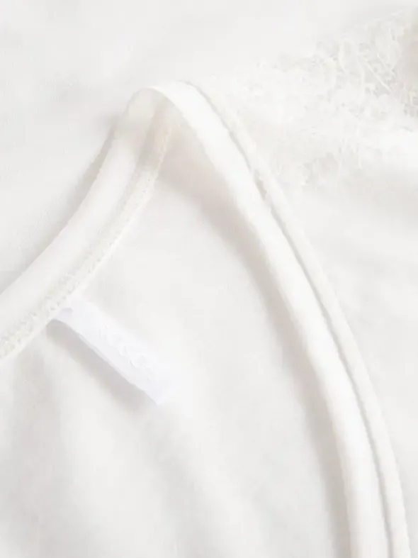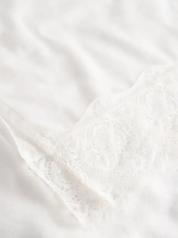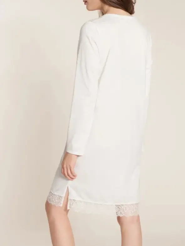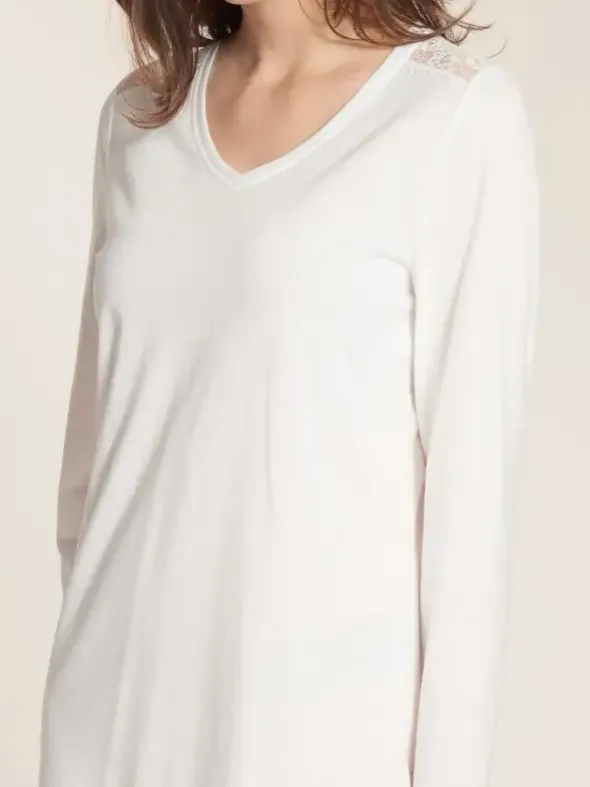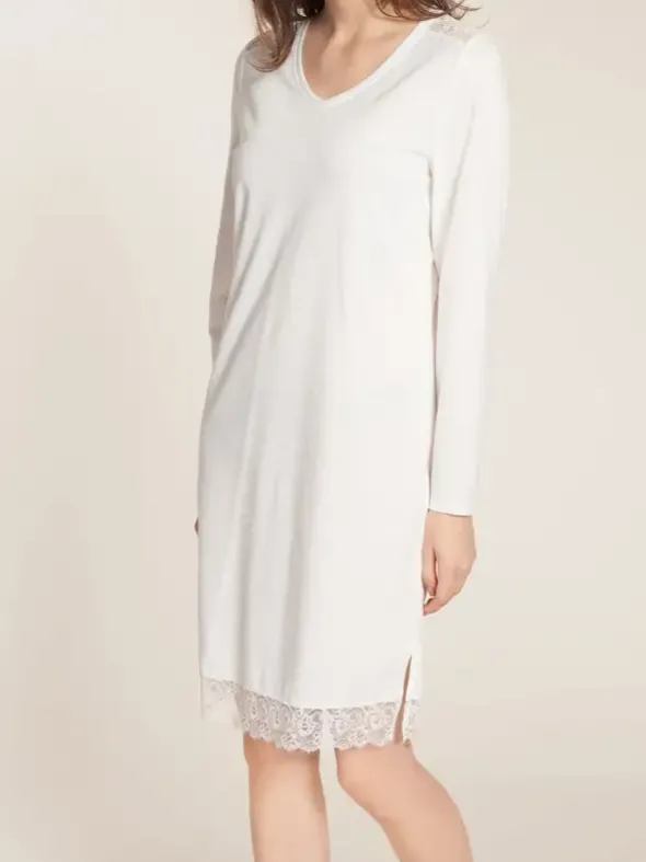 Das Jersey-Nachthemd von Rösch besticht mit romantischen Einsätzen aus französischer Spitze. Der V-Ausschnitt ist sanft abgerundet, der gerade Saum ist für einen hohen Tragekomfort seitlich geschlitzt. Eine knieumschmeichelnde Länge von 95cm rundet den Look wunderbar ab.