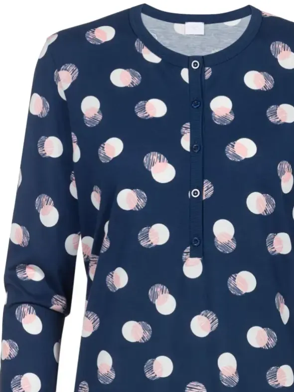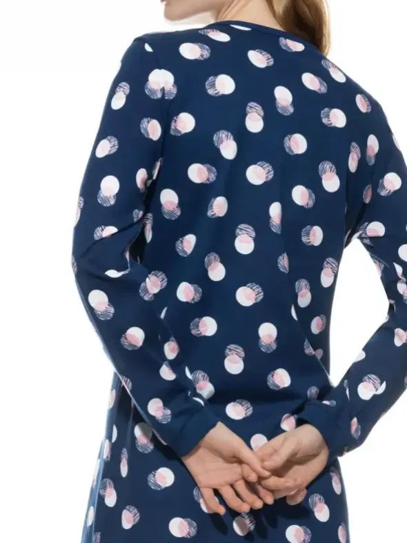 Dieses langärmelige Nachthemd aus der Serie „Scribbled Dots“ bietet eine legere Passform und ist ideal für kühlere Nächte. Mit gerippten Bündchen an den Ärmeln, einem gerippten Rundhalsausschnitt mit Knopfleiste und einem fröhlichen Punkte-Print vereint es Stil und Komfort. Hergestellt aus 100% Baumwolle in Single-Jersey-Qualität, hat das Nachthemd eine Länge von circa 110 cm in Größe 38.