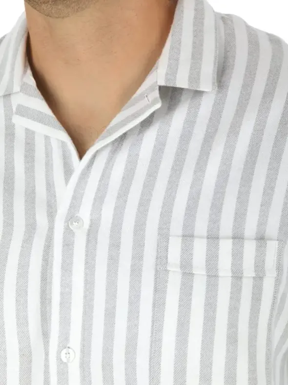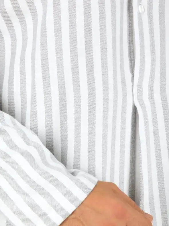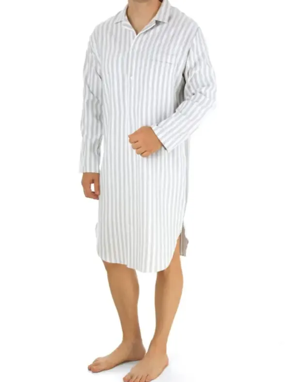 Ein edler silbergrauer Blockstreifen ziert dieses Flanell-Nachthemd Mario in voluminös wärmender Vollzwirn Qualität. Reine Baumwolle verspricht einen erholsamen Schlaf und ein angenehm natürliches Hautgefühl. Das klassische Herren Nachthemd in 110cm Länge ist mit einem Reverskragen, einer Brusttasche und einer kurzen Knopfleiste ausgestattet.