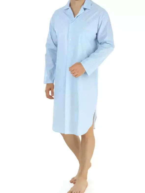 Bequemes Nachthemd Mario in praktischer Schlupfform mit halber Knopfleiste. Das 110cm lange Wäschestück ist mit einem klassischen Reverskragen und einer aufgesetzten Brusttasche gefertigt. Durch den abgerundeten Saum mit Seitenschlitzen und den glatten und griffigen Baumwollpopeline entsteht ein luftiges und außergewöhnlich bequemes Tragegefühl – ein treuer Begleiter für eine kompromisslos gemütliche Nachtruhe.
