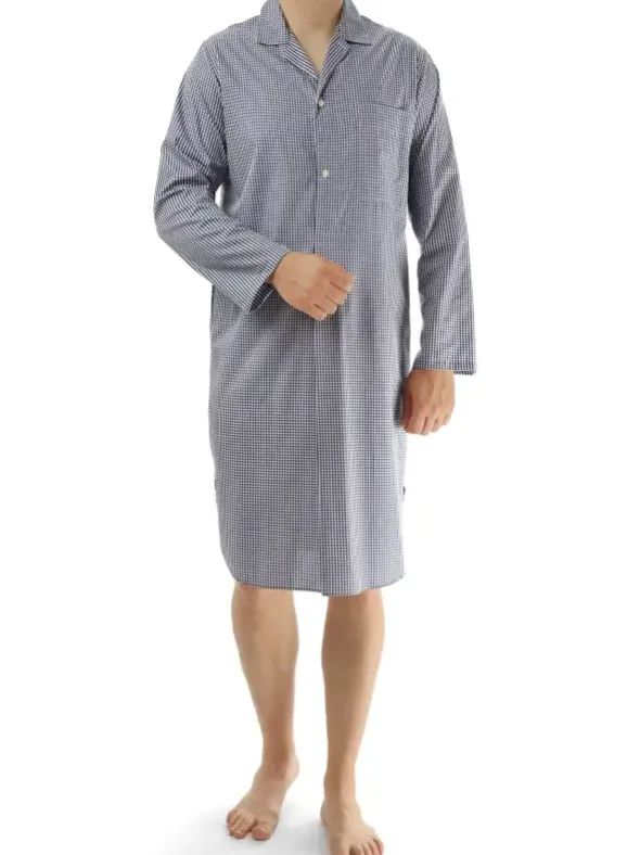 Das klassische Nachthemd Mario aus dem Hause NOVILA überzeugt mit seiner praktischen Schlupfform mit halber Knopfleiste und eckigem Reverskragen. Das feste und griffige Gewebe aus hochwertigem Baumwoll-Popeline sorgt für ein wunderbares Hautgefühl und ergänzt sich zusammen mit der praktischen Länge von 110cm und dem abgerundetem Saum mit Seitenschlitzen zu einem komfortablen Nachtwäschelook. Die aufgesetzte Brusttasche und das dezente Karomuster in Dunkelblau runden das elegante Bild ab.