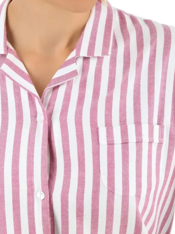 Baumwolle und Viskose vereinen sich hier zu einem super flauschigem Flanellgewebe mit herausragenden Trageeigenschaften. Der klassische Blockstreifen in einem schönen dunklem rosa-Ton verleiht dem beliebten 95cm langen Schlupfnachthemd Miriam eine feminine Eleganz. Ein abgerundeter Saum, die halbe Knopfleiste und eine aufgesetzte Brusttasche vollenden den klassischen Look.