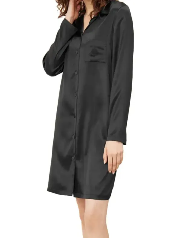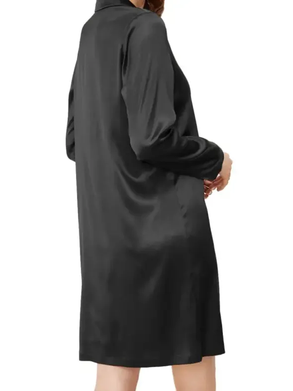 Ein klassisch elegantes Nachthemd von Féraud aus luxuriöser, elastischer Webseide. Diese ist aus biologischer Herkunft und GOTS-zertifiziert. Der Schnitt mit Reverskragen, durchgehender Knopfleiste und aufgesetzter Brusttasche ergänzt sich wunderbar zu dem edel glänzendem und fließendem Material aus hochwertiger Seide. Ein Hauch Elasthan und eine beinumschmeichelnde Länge von 90cm sorgen für einen äußerst angenehmen Tragekomfort. Gönnen Sie sich diesens exklusive Nachthemd im Herrenhemd-Stil und zelebrieren Sie die erlesenen Momente der Entspannung.