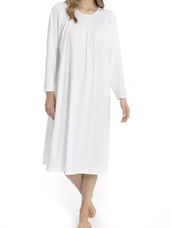 Aus der CALIDA Damen Nachtwäsche Serie Soft Cotton, ein Nachthemd – ca. 110cm lang – mit langem Arm und rundem Ausschnitt in klassischer Optik und erstklassiger Verarbeitung, wahlweise in weiß oder hellblau erhältlich. Ein angenehmes Interlock Gewebe aus feiner Baumwolle sorgt für ein tolles Tragegefühl in der Nacht.