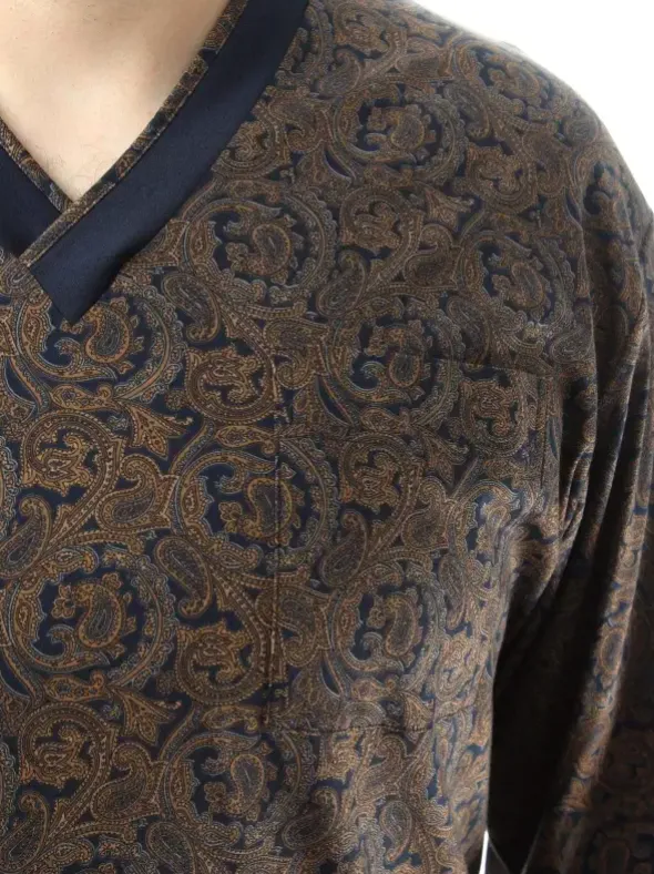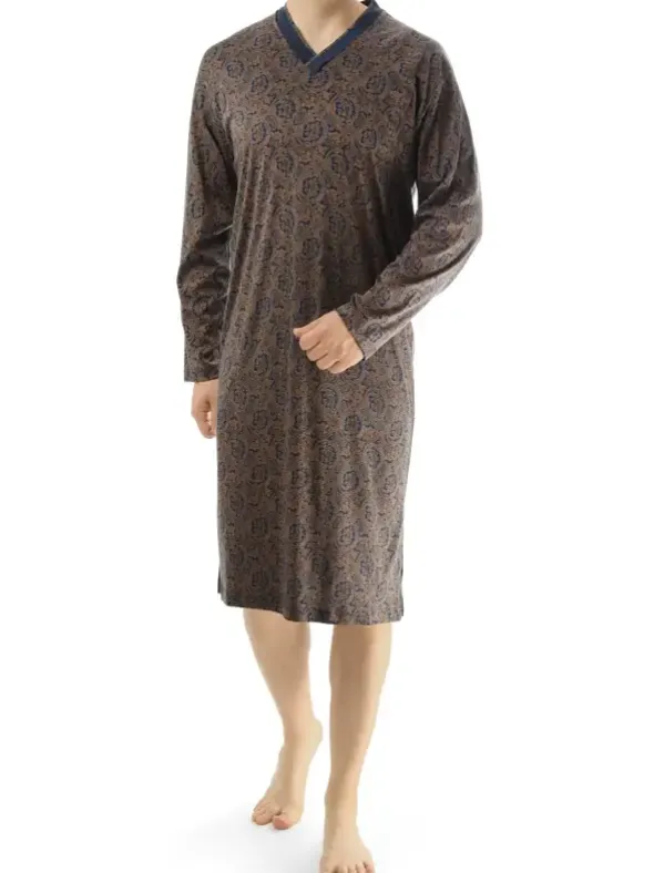 Das beliebte Nachthemd Tobias – hier in einer luxuriösen Ausführung aus Feininterlock-Jersey aus hochwertiger, merzerisierter Baumwolle mit exklusivem Printdesign. Das elegante Muster auf Marineblau wird durch eine farblich passende Paspelierung am V-Ausschnitt ergänzt. Der gerade Schnitt, die Seitenschlitze und die komfortable Länge von 115cm machen dieses Wäschestück zum treuen Begleiter für erholsame Nächte. Der langlebige Glanz und die luxuriöse Leichtigkeit zeugen von der Feinheit des Gewebes.