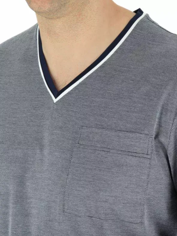 Das edle Nachthemd Tobias, hier in gedecktem Marineblau mit feinem Jaquard-Muster und schicker Paspelierung am V-Ausschnitt wird durch den weichen und hautschmeichelnden Single-Jersey in Feinzwirn-Qualität zum absolutem Lieblingsoutfit. Ein wunderbar unkomplizierter und pflegeleichter Nachtwäschelook für jeden Tag.