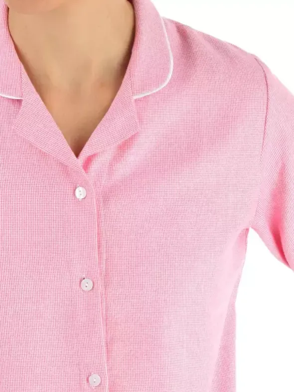 In kuschelig weichem Vollzwirn-Flanell präsentiert NOVILA den beliebten 7/8 – Pyjama Pia, erhältlich in fein kariertem Hellblau oder Flamingo. Der dicht gewebte und flauschig geraute Stoff begleitet Sie zuverlässig durch kältere Nächte. Der patentierte NOVILA Softbund mit Tunnelzug und die aufgesetzten Taschen der geraden Hose sorgen für praktischen Komfort. Das durchgeknöpfte Oberteil mit rundem Reverskragen und Paspelierung kreiert einen stilvollen Auftritt. Gehen Sie keine Kompromisse ein, wenn es um Ihr Wohlbefinden geht und entscheiden Sie sich mit diesem Zweiteiler für eine exquisite Verarbeitung, ausgewählte Rohstoffe und höchsten Tragekomfort.